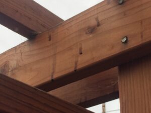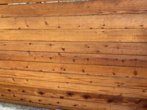 It turns out that wood putty does not work on exterior natural wood. It’s very unsightly and it falls out really quickly because the wood expands and contracts.